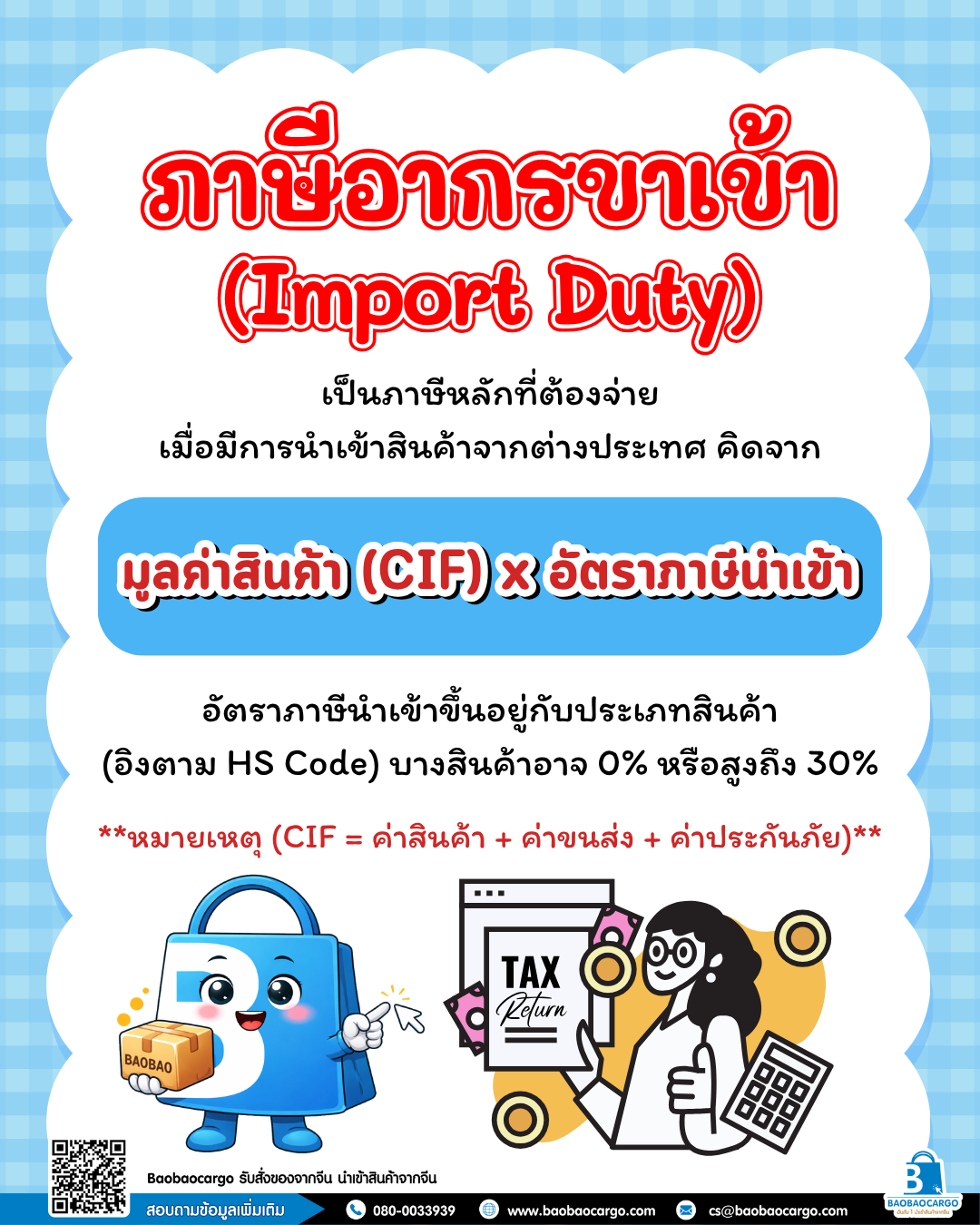 เป็นภาษีหลักที่ต้องจ่ายเมื่อมีการนำเข้าสินค้าจากต่างประเทศ คิดจาก