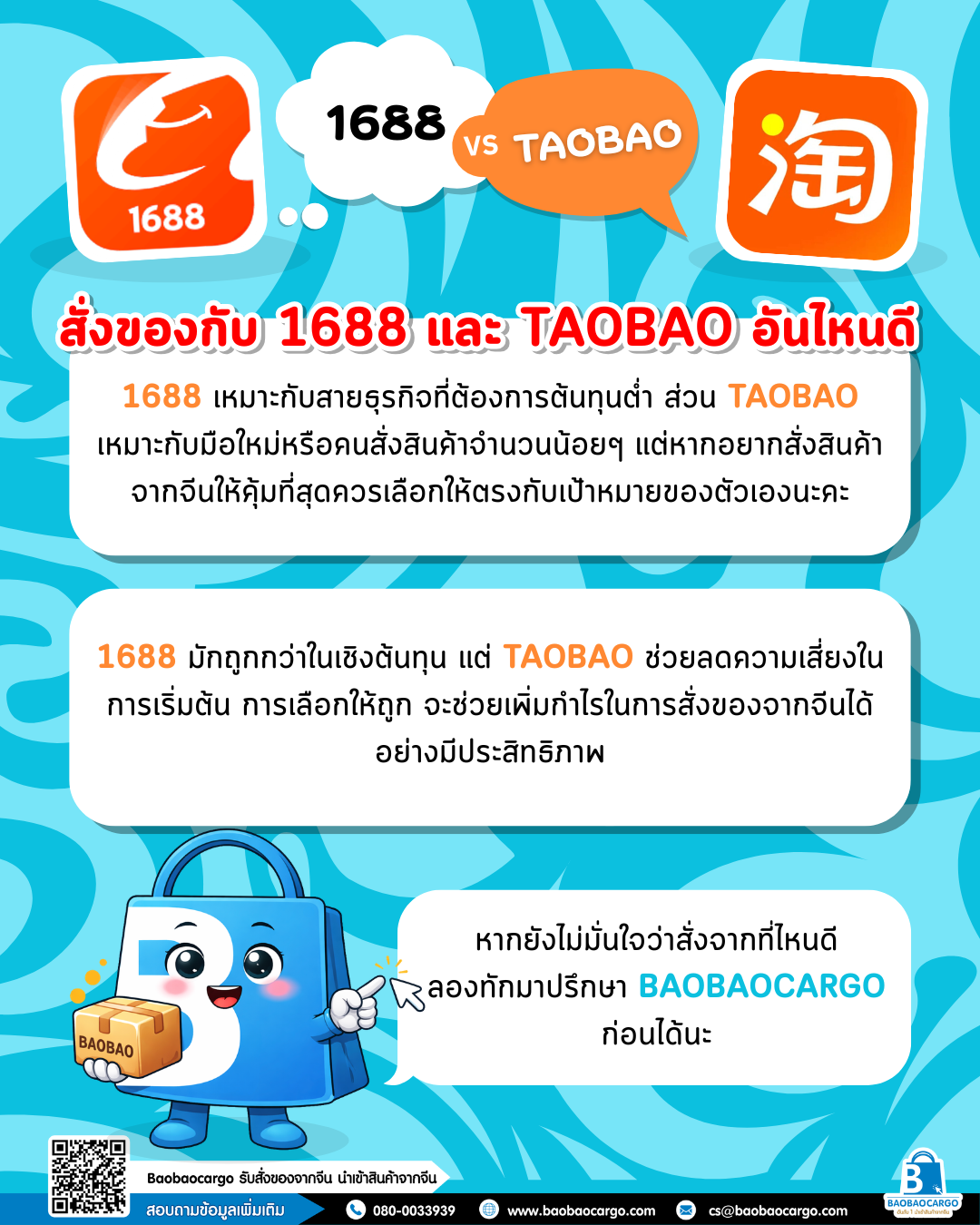 1688 เหมาะกับสายธุรกิจที่ต้องการต้นทุนต่ำ ส่วน Taobao เหมาะกับมือใหม่หรือคนสั่งสินค้าจำนวนน้อยๆ แต่หากอยากสั่งสินค้าจากจีนให้คุ้มที่สุดควรเลือกให้ตรงกับเป้าหมายของตัวเองนะคะ
